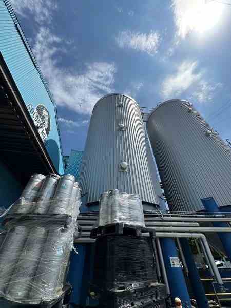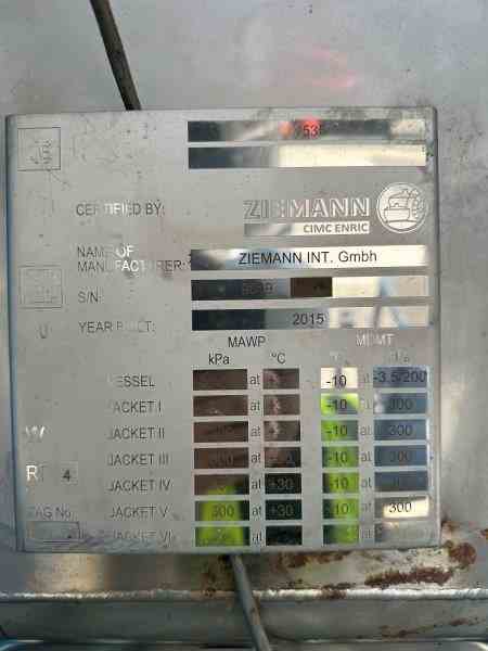 Used 27000 gallon (874 BBL) 304 stainless steel jacketed pressure vessel. Manufactured by Ziemann Bauer. Vessel Rated 29psi @86F, jacket rated 43psi @86F. 13' 7" dia x 42' tall. Dished head and bottom.Previously used in brewery as fermenter, cooled with Glycol @24F. National board #535. Serial #9619. Built 2015.