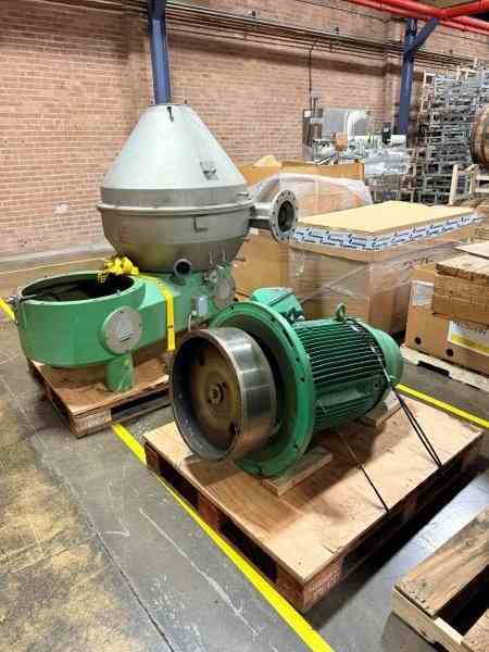 Used GEA Westfalia Separator/Disc Centrifuge. Model GSE 125-06-777. 5900 rpm bowl speed. 1,10 kg/dm3 heavy liquid. Rated 14.5 psi @194F. 1.26 kg/dm3 solids. Serial #1731-307. Skid dimensions: W- 7’8” x L-10’ x H-7’. Built 2011.