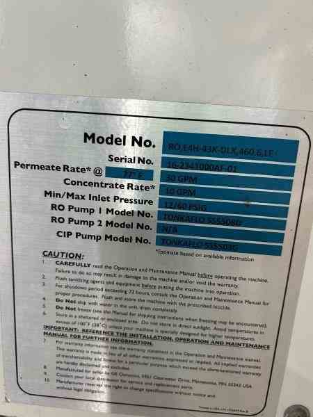 Used 30 GPM RO system. Manufacture by GE. Model #RO,E4H-43K-DLX,460,6,LE. 60 psi max inlet pressure. 30 GPM @77F permeate rate. Includes TONKAFLO SS5508D RO pump and TONKAFLO SS5503G CIP pump. Serial # 16-2341000AF-01.