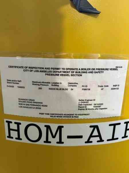 Used Air receiver. Manufactured by Samuel pressure vessel group. Rated 200 psi @400F. ASMED coded, NB #1049253.