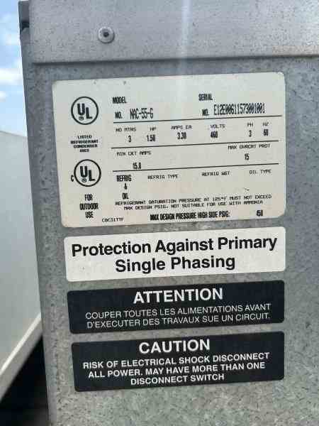 Used 4.5 HP glycol chiller, manufacutred by Pro System. Model #NAC-55-G. max design pressure (high side) 450 psig, refrigerant saturation pressure 450 psi @125°F. (3) 1.5HP electrical motor, 3Phase/60Hz/460V each. Past use in brewery.