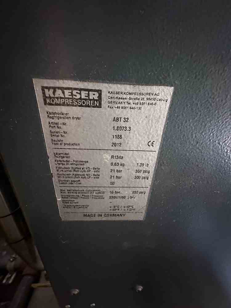 Used 124 cfm screw type air compressor. Manufactured by Kaeser, model AS 30T. Rated 125 psi. 30 HP/60Hz/3Phase electric motor. Serial #1045. Includes ABT 32 air dryer rated 230 psi @110F max. All built 2012.