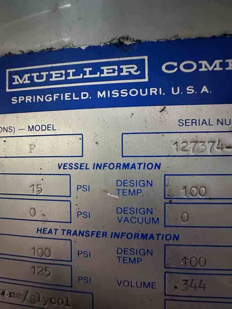 Used 4340 Gallon Stainless Steel jacketed pressure vessel. Built by Mueller. Dome Top, cone bottom. (4) leg mounted. Shell rated 15 psi @100F, jacket rated 100 psi @100F. Serial #127374-1. Past use DA tank in a brewery.