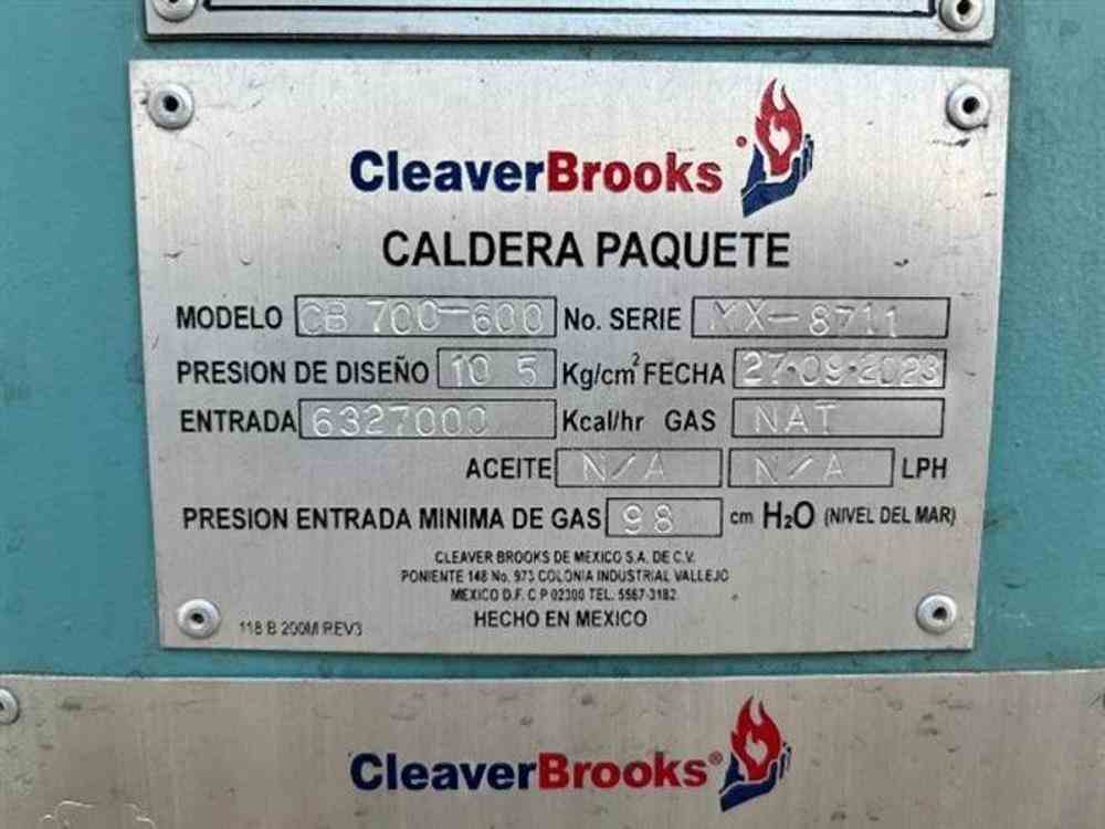 Unused 600HP Cleaver Brooks Firetube steam Boiler. Model CB 700-600. Natural gas fueled. 600 HP. 150 PSI maximum working pressure. 3000 square feet heating surface. 10.5 kg/cm2 design pressure. 6327000 kcal/hr inlet. 98 cm H20 minimum gas inlet pressure. Serial# MX-8711. Built 2023.