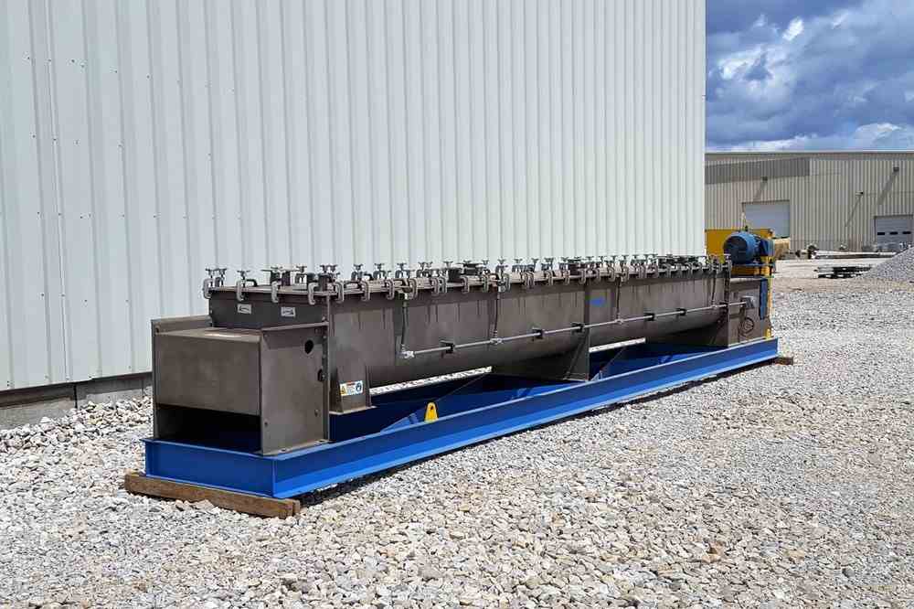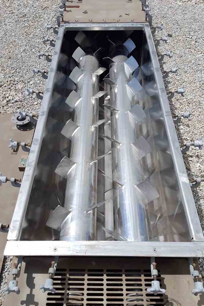 Unused 50 Cu Ft Andritz Conditioner Stainless Twin Agitator Mixer Pug Mill. Model DA30-21 Series 2.304 Stainless Steel material contact parts. 6 Additive Ports, Gear Box Assembly With FAZ 107 AD, 30HP, 460 volt, 1765RPM, 3 phase, 60Hz with belt/gear drive. Agitator speed = 150 RPM. Dimensions: 28'-8" L x 3'-4" W x 4'-8" H. 12500 lbs. Serial #132090174-2012. Built 2012.