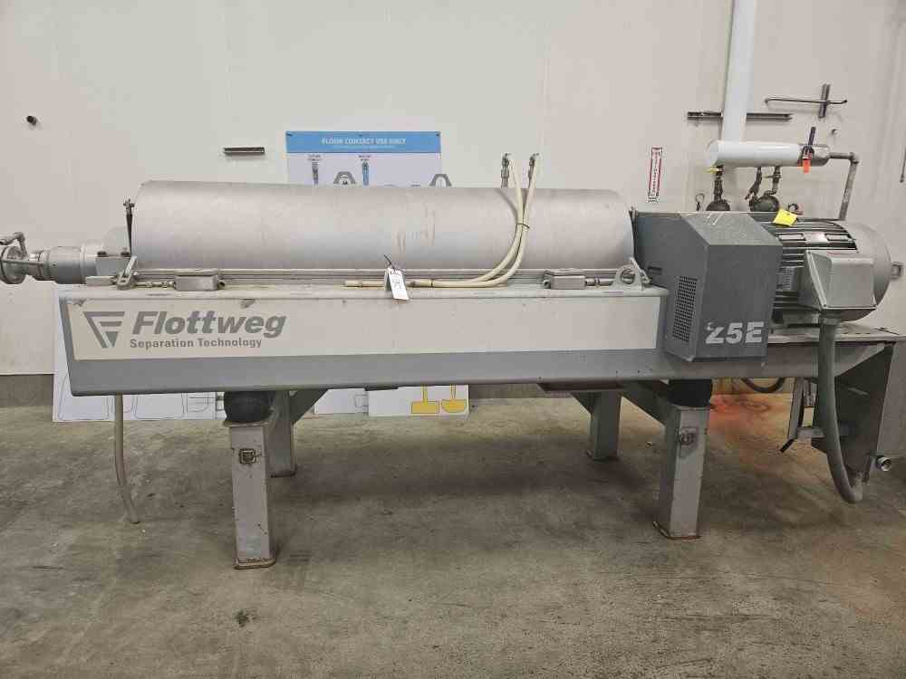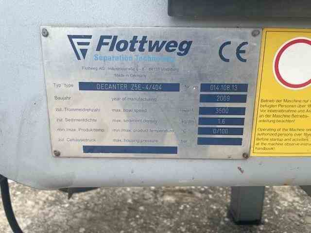 Used 24" Flottweg Decanter Centrifuge, Model Z5E-4/404. Stainless steel contacts. 3500 rpm max. 1.6 max sediment density. 100 degree C max. Pumped discharge. 14 degree beach with wear protection. Includes 75 Hp Main drive - back drive - stand. Serial# 014.108.13. Built 2009. Previously used for food.