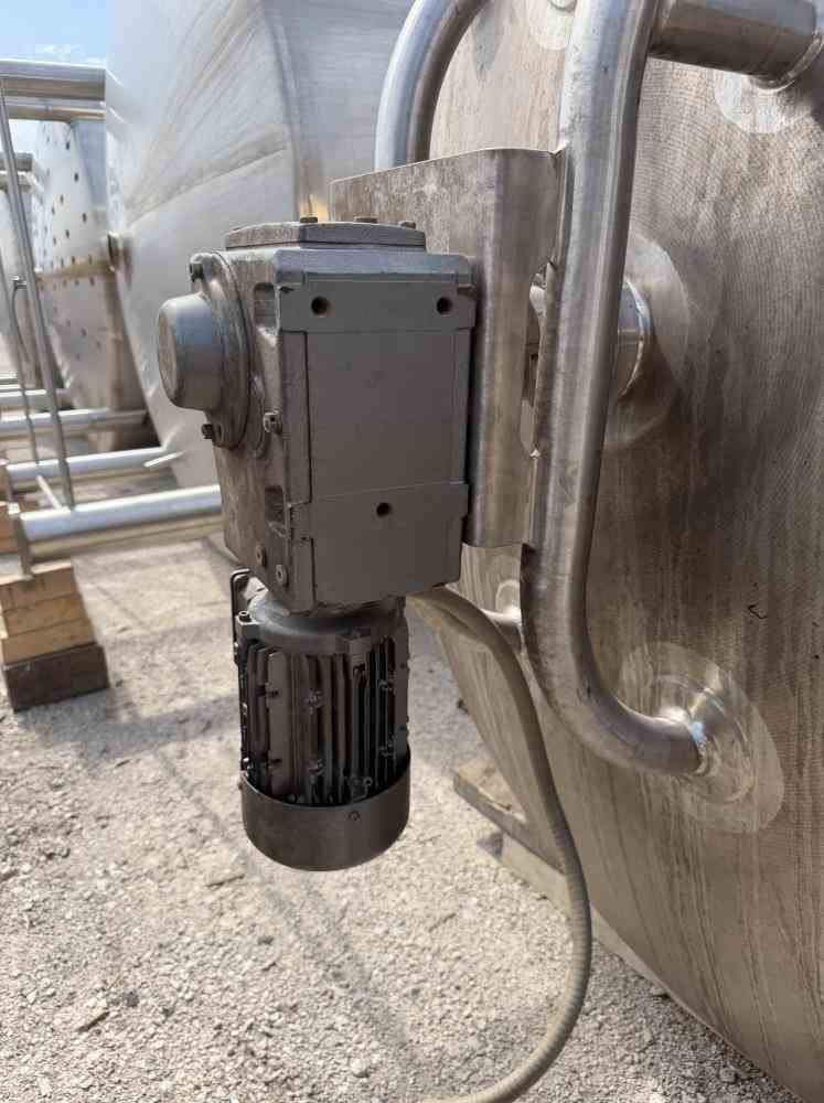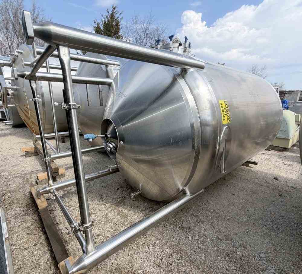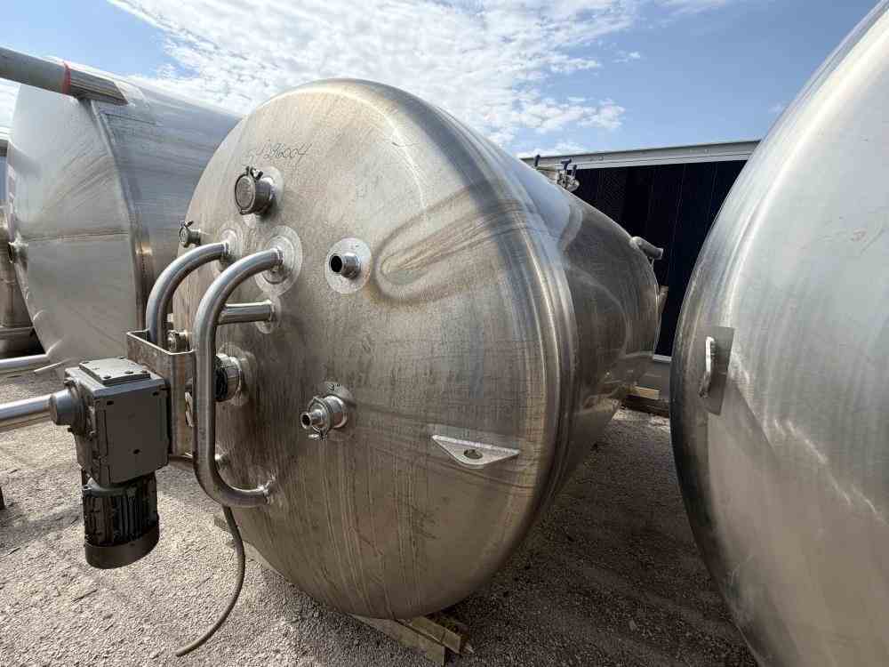 Used 2600 gallon Insulated 304 Stainless Steel Agitated Processor Tank. Manufactured by Feldmeier. 84" diameter x 102" straight side. Dish top and cone bottom. Internal rated 40/FV psi @350F. Bottom Cone only insulated and dimple jacket rated 100 psi @350F. Spray ball, baffle. Top mounted, vertical bottom sweep agitator, driven by a 2hp 3/60/230/460v 1660rpm motor through reducer. Openings Top: (2) 4", (3) 3", (2) 2", Side bottom manway, (2) 2" side openings. 3" Center bottom outlet with 28" discharge height. Mounted on (4) stainless steel legs. Serial # E134213. National Board # 8806. Built 2014.
