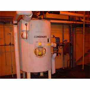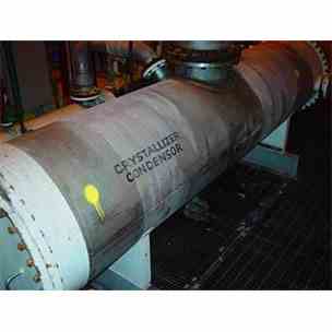 1500 lbs/hr. double effect forced circulation falling film evaporation/crystallizer system. MFD by: Blaw Knox, Serial # 103-86466. 1st effect RRFC (recirculating, rising falling concentrator): The separator body de-entrains the vapor and separates vapor from splash or droplets. NB# 8446. Max working pressure 109 psi @ 300 deg. F. Volume 440 gallons. Shell and heads made of 316SS, 36" dia. x 8'6" long. Openings: Top - 12" elbows, 4-1", 1-2", 1-3", 1-10". conical section 12" dia. x 20" long. Evaporator steam chest 1st effect: Type Double KFC vent 330 sq. ft. Shell 24" dia. x 9'11 7/8" long. ASME code stamped. Serial # 17863. CS shell rated 75 psi & FV @ 400 deg. F, tubes rated 75 psi @ 400 deg. F. With (84) 1 1/2" OD x 18 BWG x 10' long 316SS tubes, CS shell. 2 pass design on tube side. Evaporator vapor body 1st effect: 36" side elbow inlet type separator for final separation of vapor from liquid. Internal mesh demister. Crystallizer steam chest, 2nd effect: 462 sq. ft. all 316SS horizontal shell and tube heat exchanger. Shell 28" dia. x 9'4" long with flat heads. ASME code stamped. With (25) 1" OD x 16 BWG x 9'4" long 316SS tubes. Shell rated 75 psi & FV @ 400 deg. F, tubes rated 75 psi & FV @ 400 deg. F. Crystallizer vapor body, 2nd effect: 60" dia. x 24'9 1/4" long x 46 3/4" conical bottom draft tube type flash chamber and crystallizer body. 316SS. 3170 gallon volume. Conical bottom. Internal mesh demister with water spray. Crystallizer condenser: 1663 sq. ft. horizontal, 316SS shell, CS tube condensor. 36" dia. x 15'4" long 316SS shell, with vapors condensing on the shell side. Tube side is for pass for cooling water. (716) 3/4" OD x 18 BWG x 12' long 316SS tubes, with 179 tubes baffled on the shell side. ASME code stamped. Shell rated 75 psi & FV @ 400 deg. F, tubes rated 75 psi @ 400 deg. F. Vent condenser: 27.5 sq. ft. horizontal condensor. 8 5/8" dia. x 6'10" long shell. 4 pass on the tube side. 316SS shell rated 75 psi & FV @ 400 deg. F. 316SS tubes rated 75 psi @ 400 deg. F. Evaporator preheater: 64.6 sq. ft. Tranter 2 stage, 316SS plate exchangers. Each equipped with 10 plates type UX-216-UJ-20. Rated 150/150 psi on service and process sides. Evaporator circulating pump, 1st effect: (Stock # 111074), Goulds type 3196, size 2 x 3-6 316SS centrifugal pump. With mechanical seal. Rated 100 GPM @ 35 TDH @ 1730 rpm. Driven by 3 hp 3/60/460V, 1760 rpm TEFC motor. Crystallizer feed pump: (stock# 111075), Goulds type 3196 size 1 x 1.5-6 316SS centrifugal pump. With mechanical seal. Rated 25 GPM @ 35 TDH. Driven by 1.5 hp 3/60/230/460V 1780 rpm TEFC motor. Crystallizer circulation pump, 2nd effect: (stock# 111071), Goulds type 3175, size 10 x 12-18m 316SS centrifugal pump. Rated 2700 GPM @ 37 TDH, with mechanical seal. Driven by 75 hp 3/60/230/460, 1773 rpm TEFC motor. Centrifuge feed circulation pump: (stock# 111072), Wemco reversed impeller torque flow type. Model E, size 2 x 11.5 316SS centrifugal pump. Mechanical seal. 1750 rpm motor by 5 hp 3/60/230/460V TEFC motor. Impeller diameter 8 3/4". Serial # 8296177-1. Rated 50 GPM @ 35 TDH @ 1170 rpm. Vacuum system: (stock # 111070), Skid mounted system consisting of a SIHI type LPHY 75330 two stage water seal vacuum pump, driven by 50 hp, 3/60/230/460V 1770 rpm TEFC motor. Rated 823 CFM @ 200 Mbar. With steel tank separator 18" dia. x 3' high, mounted on legs. Connected to Goulds centrifugal pump type 3196, rated 40 GPM @ 55 TDH, driven by 2 hp 3/60/460V, 1750 rpm TEFC motor. (2) 33 sq. ft. 316SS Tranter plate heat exchanger / coolers. Control box. Demineralizer skid system for evaporator, MFD by OSK.