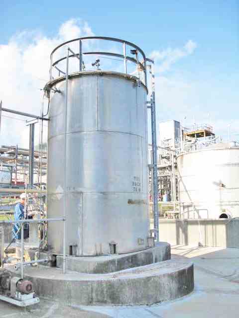 Used 8,000 Gallon vertical 304L-SS Storage Tamk, Mfg by James Machine Works, 1992; API-620 design. Slight cone top, sloped bottom. 9' 8" dia x 15' Straight side. Rated atmosheric at 100 deg F. Wall thickness 3/16". Nozzles: TOP - 2"; SIDES - 18" Manway, (2) 1.5"; Bottom - 2".