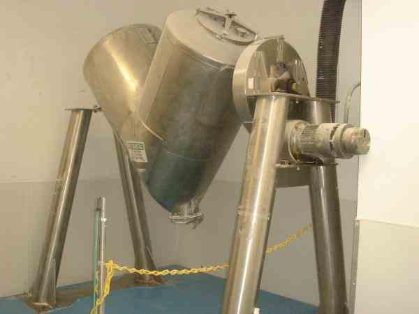 Used 30 cu ft Patterson Kelley twin shell blender, all stainless steel construction, including shell, covers, guards and tubular stands, rated 55#/ cu ft max material density, approximately 18" feed port with covers, approximately 8" discharge with butter fly valve, with motor drive with electric brake, serial# 211060.