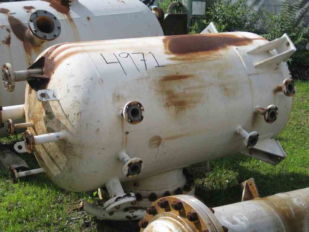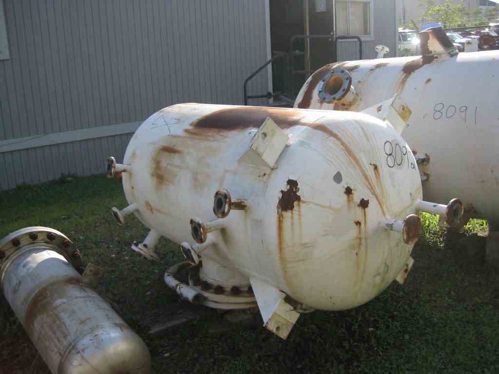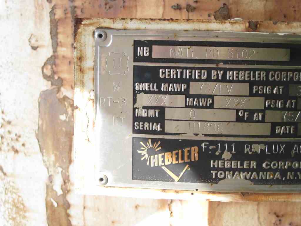 Used 300 Gallon vertical Carbon Steel Tank. Internal Rated 75 PSI/FV @ 300 deg F. Dished heads. 3' ID x 5' T/T (OAL - 7' 7"). Thickness: 3/8". Lug Mounted. Manufactured by Hebeler, 1993. S/N: H1896, NB # 5102. Previous Use: Reflux Accumulator. Approx Wt: 1460 lbs.