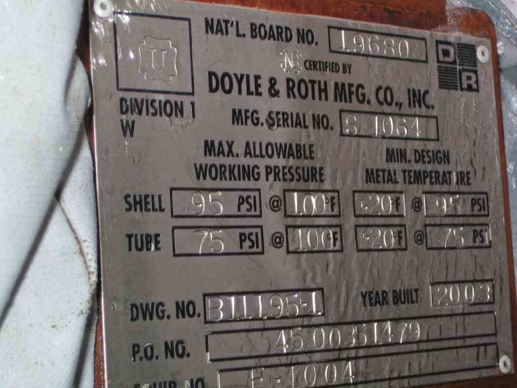 Used 20 Sq Ft Horizontal CS Shell & Tube Heat Exchanger. CS Shell rated 95 PSI @ 100 deg F. CS Tubes rated 75 PSI @ 100 deg F. Shell dia : 6.625" x 4'. (26) tubes, 3/4" dia x 4' L. Nozzles: Shell - (2) 2"; Tubes - (2) 1.5". Type BEM. Mfg by Doyle & Roth, 2003, S/N: S-1064, NB# 19680. Previous use: Styrene Exchanger. Weight: 400 lbs.