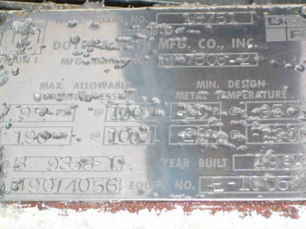 Used 94 Sq Ft Horizontal SS Shell & Tube Heat Exchanger. CS Shell rated 95 PSI @ 10 deg F. CS Tubes rated 190 PSI @ 100 deg F. Shell dia : 8.625" x 10'. (48) tubes, 3/4" dia x 10' L. Nozzles: Shell - (2) 3"; Tubes - (2) 2". Type BEM. Mfg by Doyle & Roth, 1994, S/N: J-7506-2, NB# 16751. Previous use: Styrene Cooler. Weight: 4900 lbs. U-1 & Drawing on file.