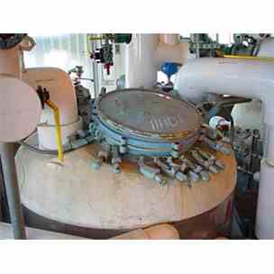 1000 gallon vertical glass lined tank. 60" dia. x 72" straight side. 2:1 semi elliptical top, dished bottom. MFD by Pfaudler , type CVC 1000-50. Serial # J016714, NB# 49095, built 1997. ASME code stamped for 50 psi & FV @ -20/+45 degrees F. With glass 9119. Openings: Top - 1-24" nucerite manway with cover, protecting ring, spring assist, 5-4", 2-3"; 1-4" center bottom outlet. With dip tube with PVCO thermometer type TE6025. Radar Level gauge. Mounting lugs.