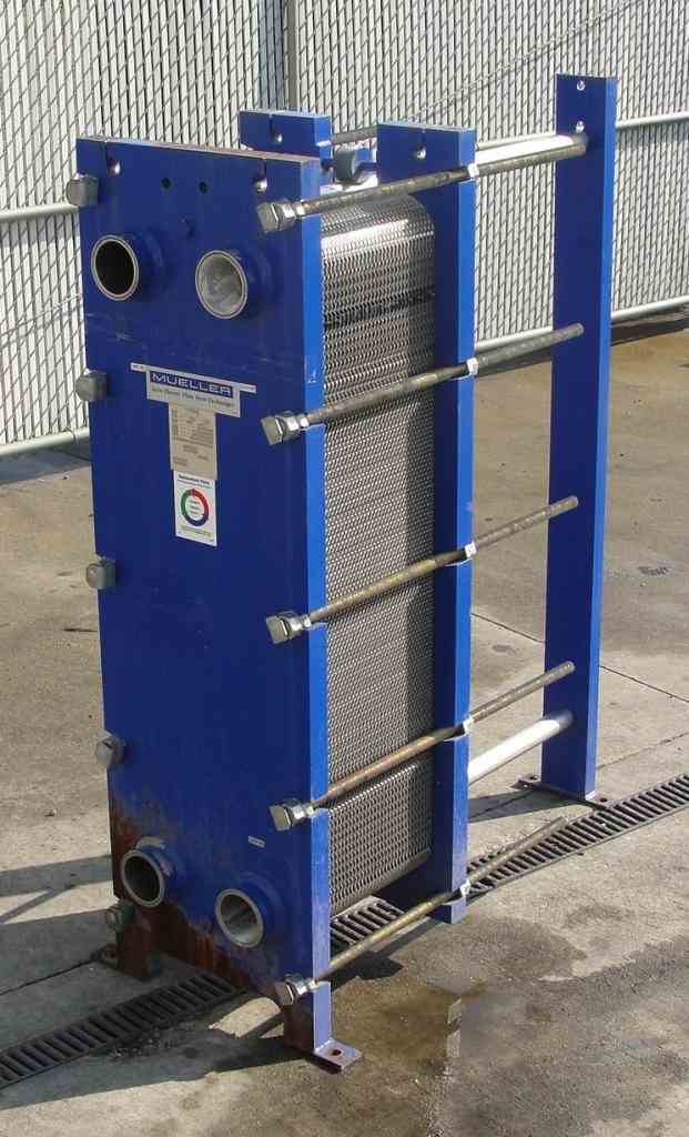 Used Mueller Accu-Therm 346.5 sq ft stainless steel plate heat exchange. Has (70) 55" x 17" plates. National Board # 41298. Model AT40 F-20. Serial # 353920. Maximum working pressure is 150 psi @ 350 deg F. Minimum Design Metal Temperature is 32 deg F @ 150 psi. Maximum pack length for 70 plates is 15.9" and minimum is 15.34". Heat exchanger has (4) 3" sanitary Tri-Clamp inlets/outlets. Gasket material is EDBM. Plates are on stainless steel rods that connect to carbon steel ends. Built in 2006. Good condition.