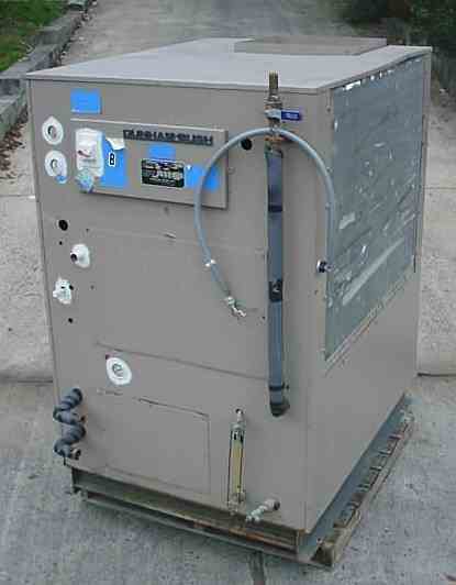 USED DUNHAM BUSH 7.5 TON CAPACITY LIQUID CHILLER, UNIT (MODEL) AMPC 7.5, SERIAL # 75D0413. FEATURES SKID MOUNTING WITH CABINET ENCLOSURE, OPERATES ON R-22 REFRIGERANT, 460 VOLT/3 PHASE, 60 HZ, 30 AMPS, COMPRESSOR MODEL MOTOR 75HF, HIGH SIDE TEST 400 PSI, LOW SIDE TEST 162 PSI, ANALOG GAUGES FOR WATER TEMPERATURE IN AND OUT, PRESSURE/VACUUM GAUGE, 1.5 HORSEPOWER INTERNAL BLOWER EXHAUST THROUGH TOP OF ENCLOSURE WITH SQUARE OPENING. FORMERLY USED IN COSMETIC MANUFACTURING.