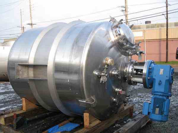 Used 3400 liter (900 gallon) DCI reactor, 316 stainless steel sanitary construction, 60" diameter x 66" straight side, dish top and bottom, rated 60 psi and full vacuum at 300 f internal, jacketed for 140 psi and full vacuum at 360 f, top mounted 10 hp, 230/460 volt agitator drive with shaft and 6 blade agitator, 18.18:1 gear box ratio, 18" man way, 5", 4:, (3)3", (2)2", 1.5" top nozzles, (2)1" bottom outlets, side lug mounted, serial# 94PH49870, national board# 2839, new 1994.