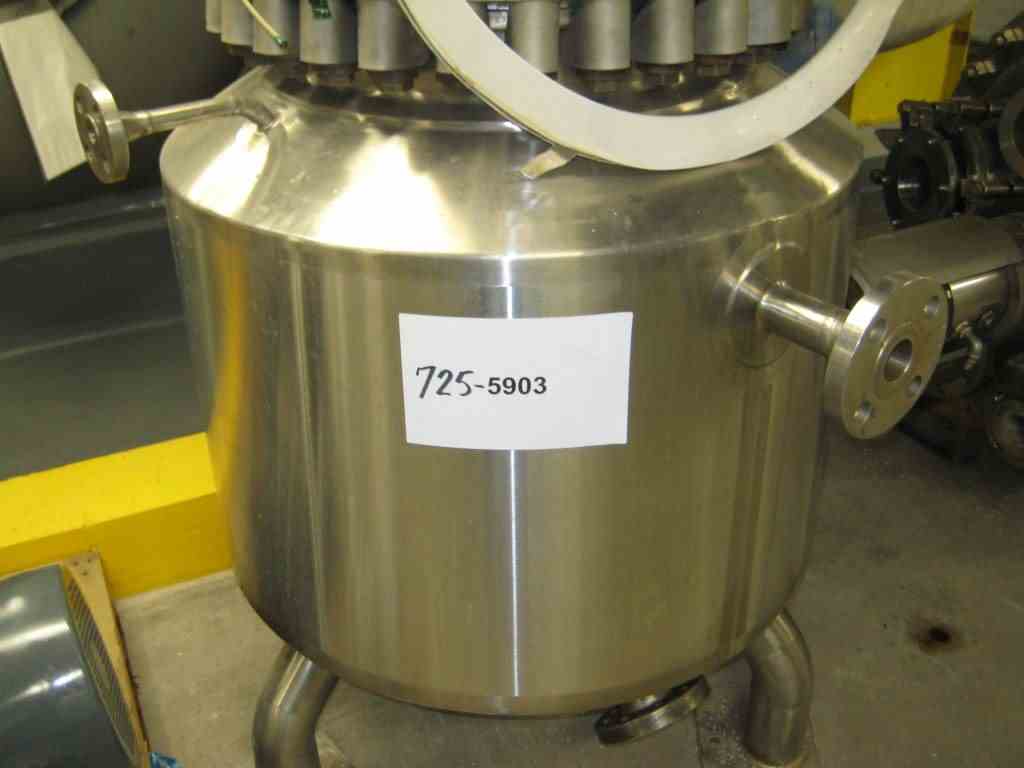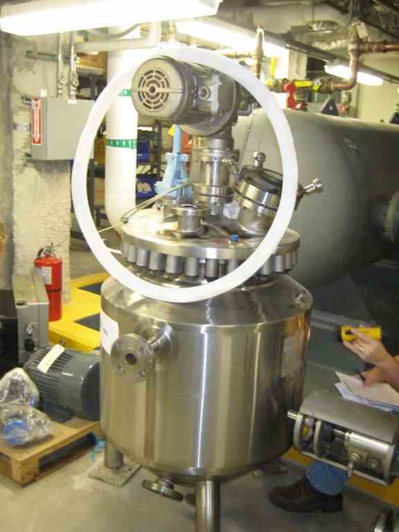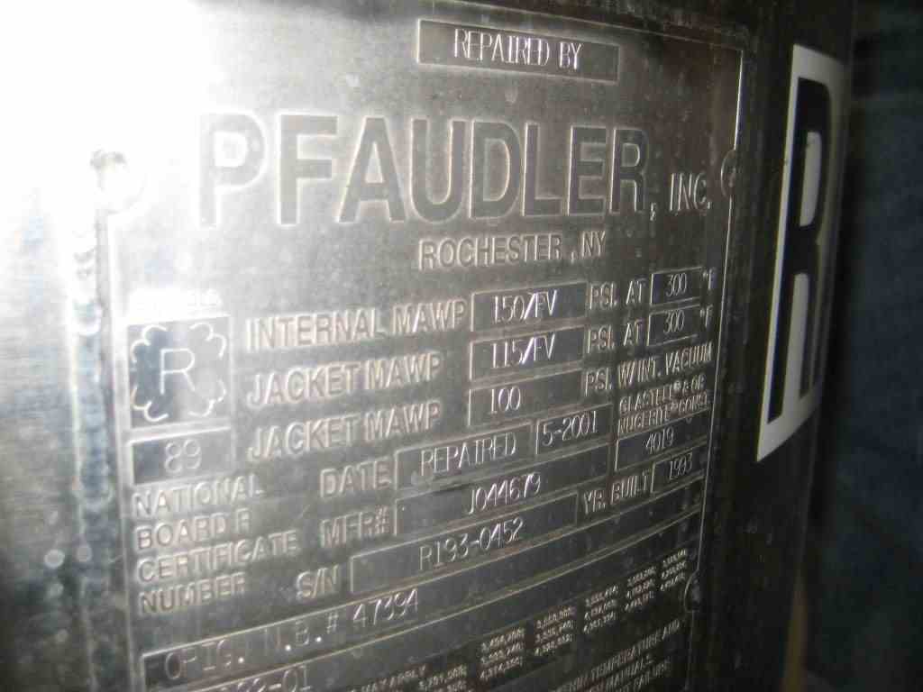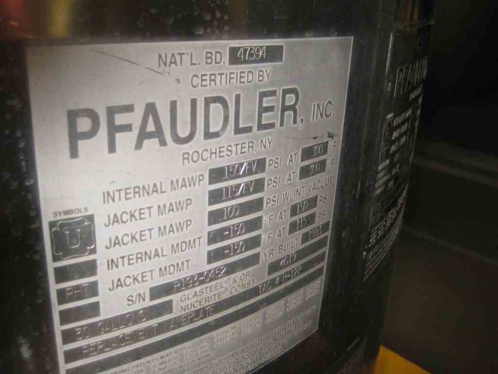 Used 30 gallon Pfaudler glass lined reactor. Rated 150 PSI/full vacuum internal @ 300 Deg. F. Jacket rated 115 PSI/full vaccum @ 300 Deg. F. Top head plate. Dual-flight agitator, 2HP, 3 phase, 60 cycle, 230/460 volt, 1720 RPM. 3” sight glass, center agitator nozzle, (2) 2” openings. Built 1993, S/N R193-0452, NB 47394; repair by Pfaudler, May 2001, Mfg. #J044679, NB #89.