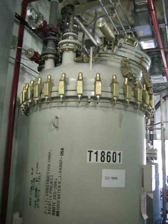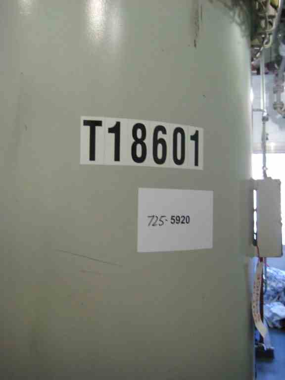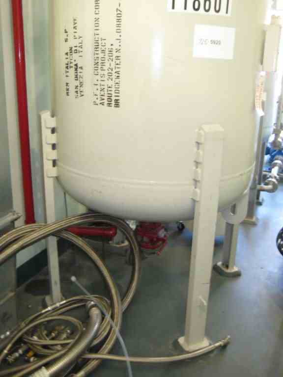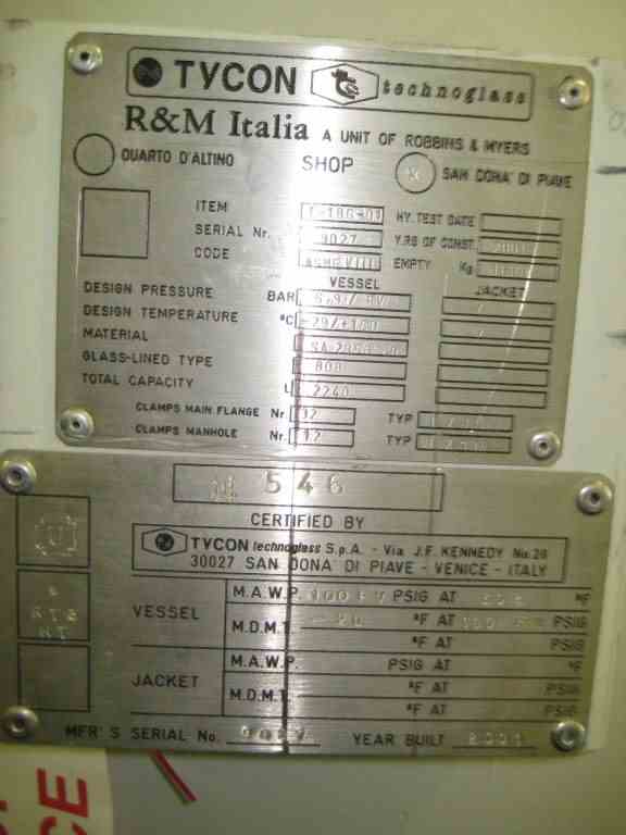 Used Tycon approximately 590 Gal. vertical glass lined receiver. 4’ Dia. x 4’6” straight side with dished top and bottom heads. 808 glass. Rated 100 PSI/full vacuum internal @ 302 Deg. F. full clamp top. 24” top manway and 2” center bottom outlet. On legs. Built 2001. S/N 9027, NB 546.