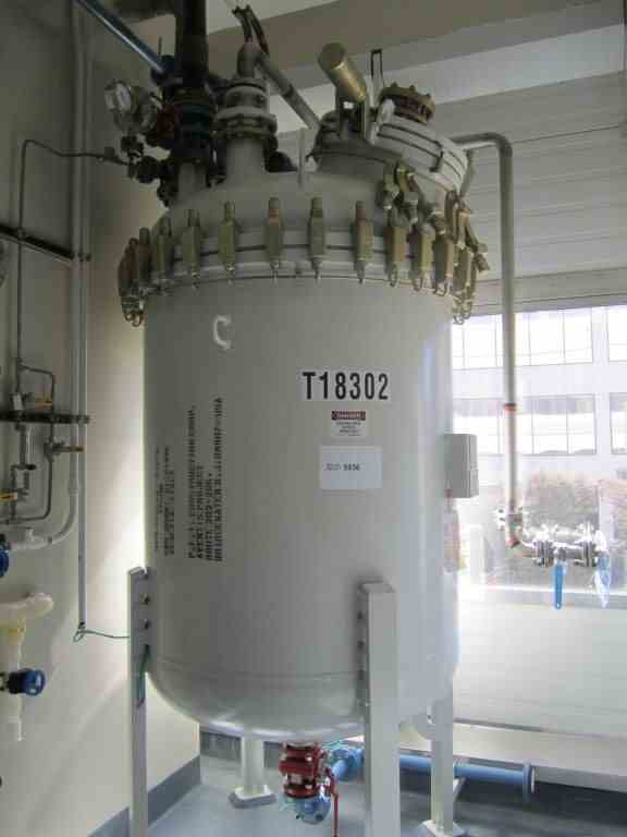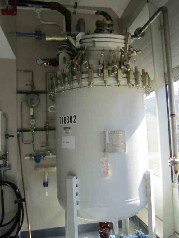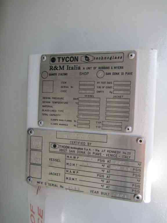 Used Tycon approximately 590 Gal. vertical glass lined tank. 808 blue glass. Rated 100 PSI/full vacuum internal @ 302 Deg. F. Full bolt-on top. Mounted on (4) legs. Built 2001. S/N 9025, NB 544. Estimated weight 1600 Kilo’s.