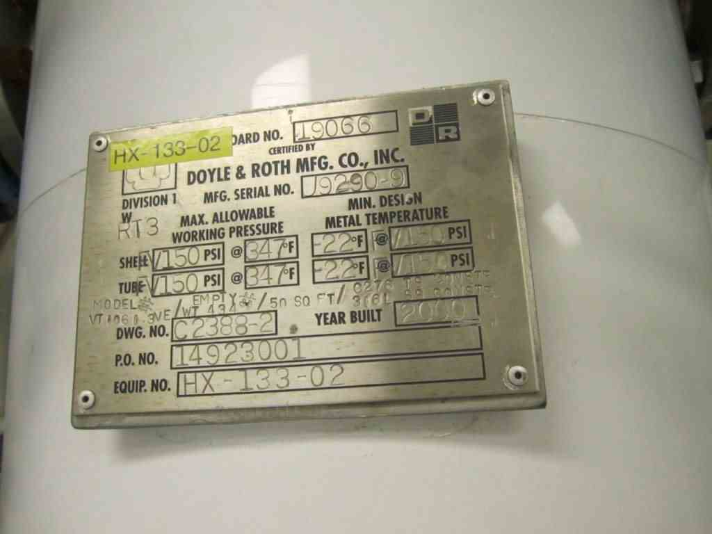 Used Doyle & Roth Model VT1061-3VE 50 square foot vertical heat exchanger. Hastelloy C276 tubes rated full vacuum/150 PSI @ 347 Deg. F. 316L stainless steel shell rated 150 PSI/full vacuum @ 347 Deg. F. Lug Mounted. Built 2000. S/N J9290-9, NB 19066.