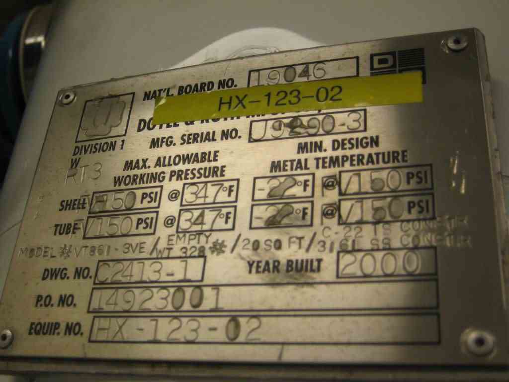 Used Doyle & Roth VT861-3VE Vertical 20 square foot heat exchanger. Hastelloy C276 tubes rated 150 PSI/full vacuum @ 347 Deg. F. 316L stainless steel shell rated 150 PSI/full vacuum @ 347 Deg. F. Lug Mounted. Built 2000. S/N J9290-3 NB 19046. Estimated Weight 323#.