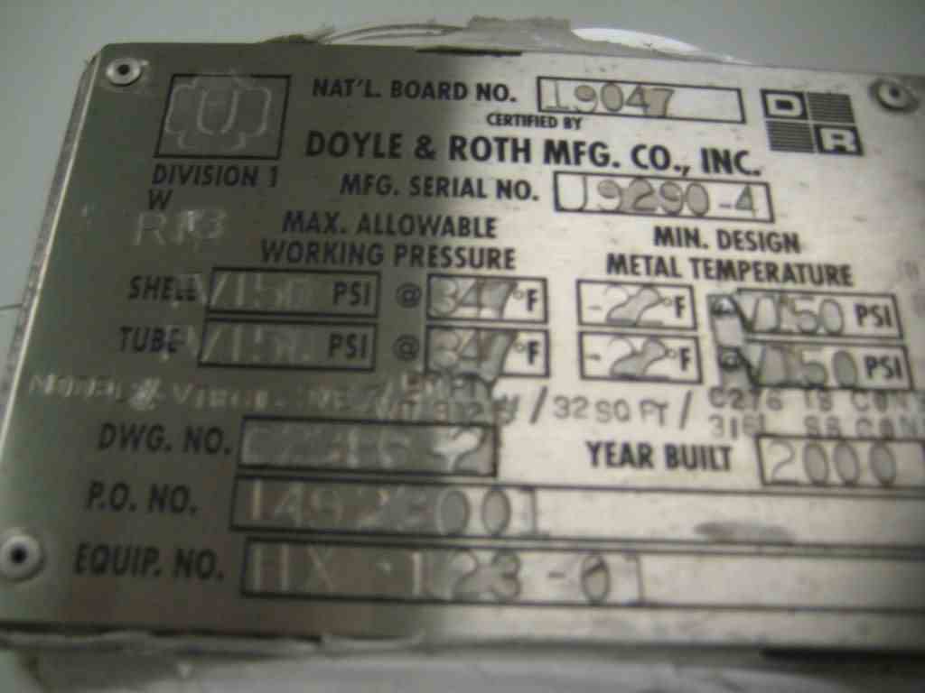 Used Doyle & Roth Model VT861-3VE 32 square foot vertical heat exchanger. Hastelloy C276 tubes rated full vacuum/150 PSI @ 347 Deg. F. 316L stainless steel shell rated 150 PSI/full vacuum @ 347 Deg. F. Built 2000. S/N J9290-4, NB 19047.