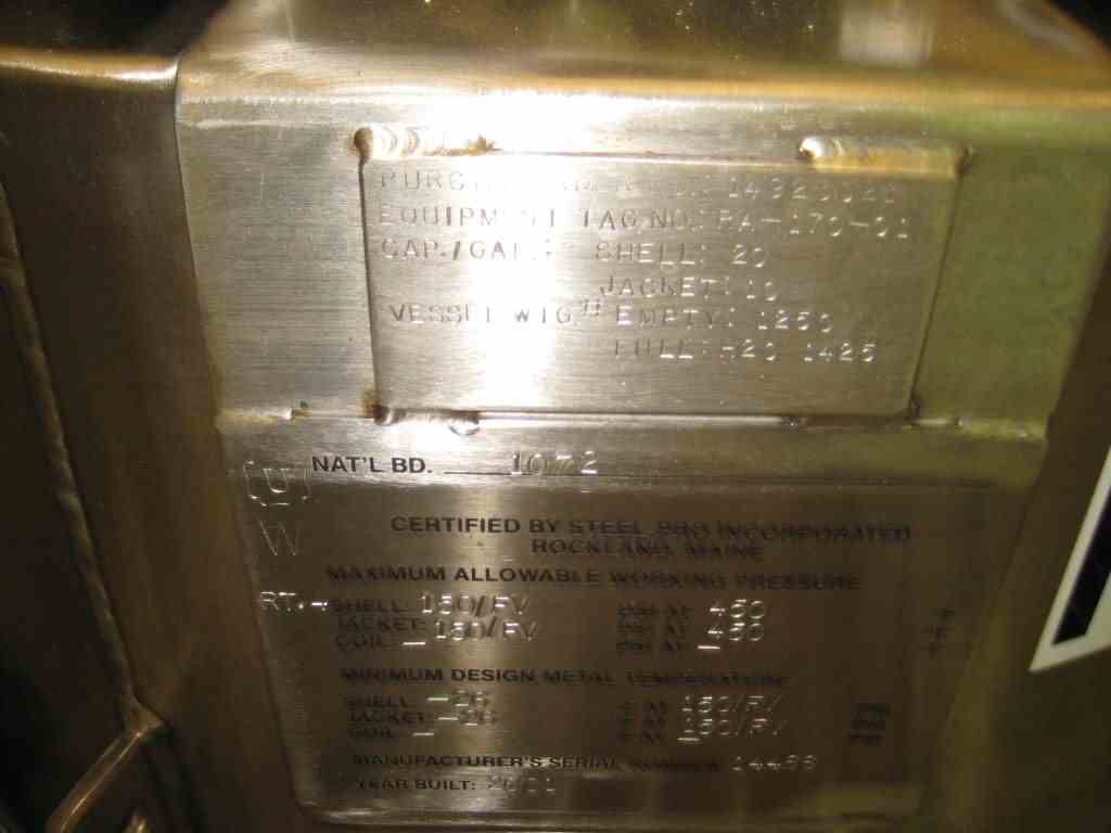 Used 20 gallon Steel Pro Inc. Hastelloy Reactor. Rated 150 PSI/full vacuum internal @ 450 Deg. F. jacket rated 150 PSI/full vacuum @ 450 Deg. Pro-Quip hydraulic agitator, Model 2TEH W350, No. 15079. Built 2001. S/N 14466, NB 1072. Estimated Weight 1250#