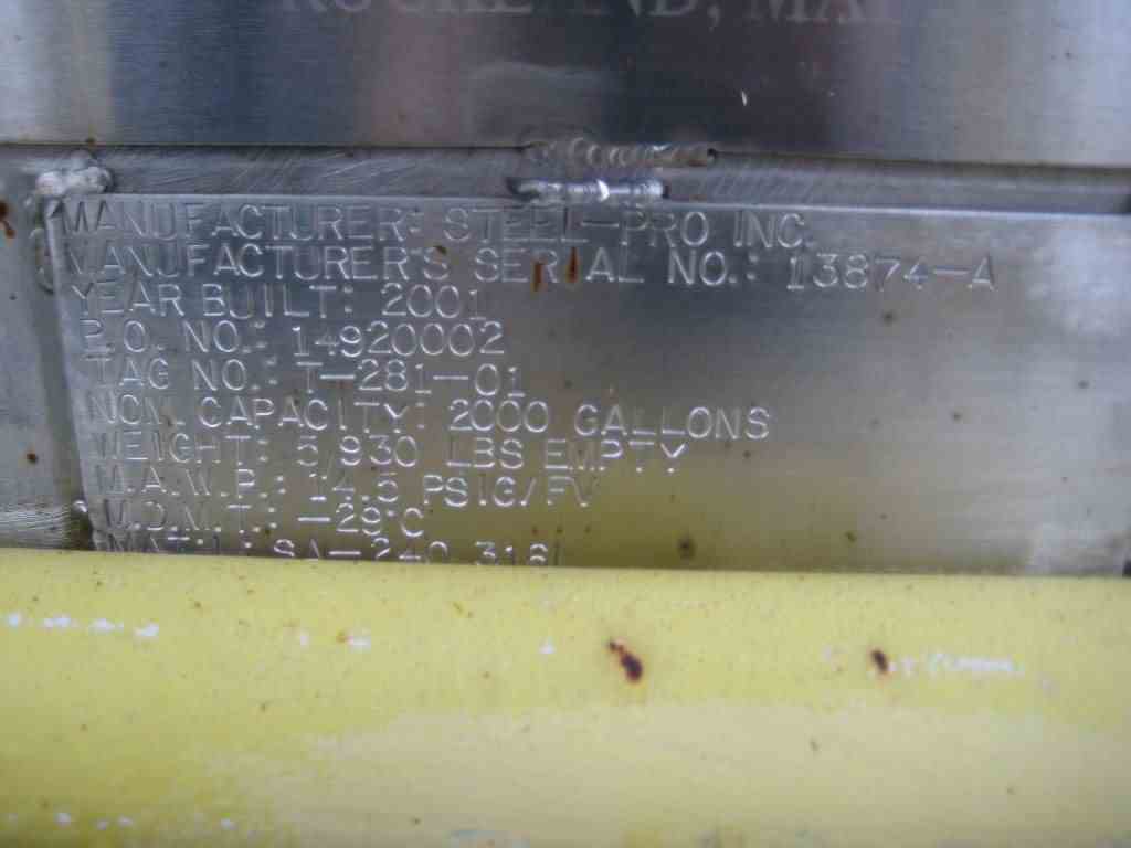 Home » Equipment » Tanks - Stainless Steel » Stainless Steel – 1,000 to 4,999 gal » 2000 Gal Steel Pro Inc. Stainless Steel Tank