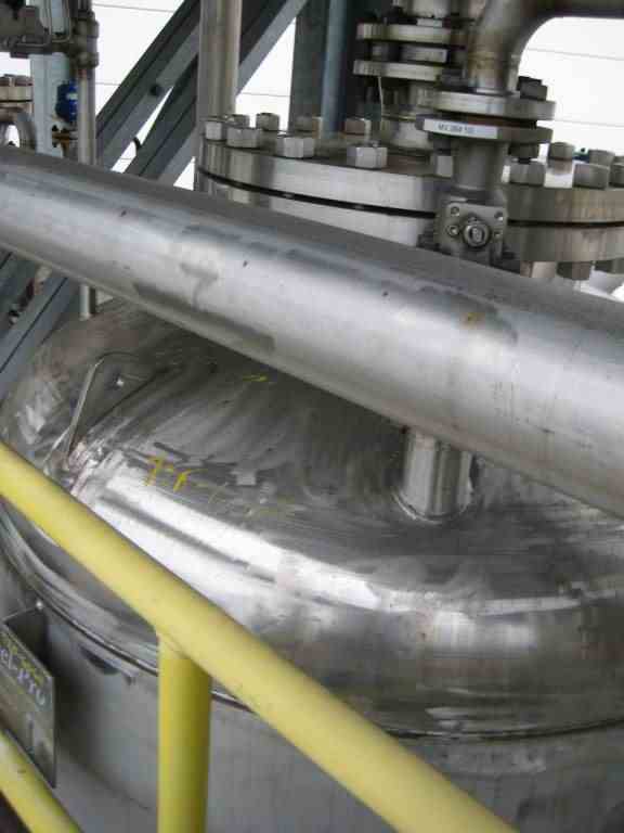 Used Steel Pro approximately 2,000 Gal. vertical 316 stainless steel tank. 5’ Diameter x 12’ straight side. With dished top and bottom heads. Rated 14.5 PSIG/Full Vacuum internal. On legs. Built 2001. S/N, 13874-D. Plant Estimated Weight 5930#.
