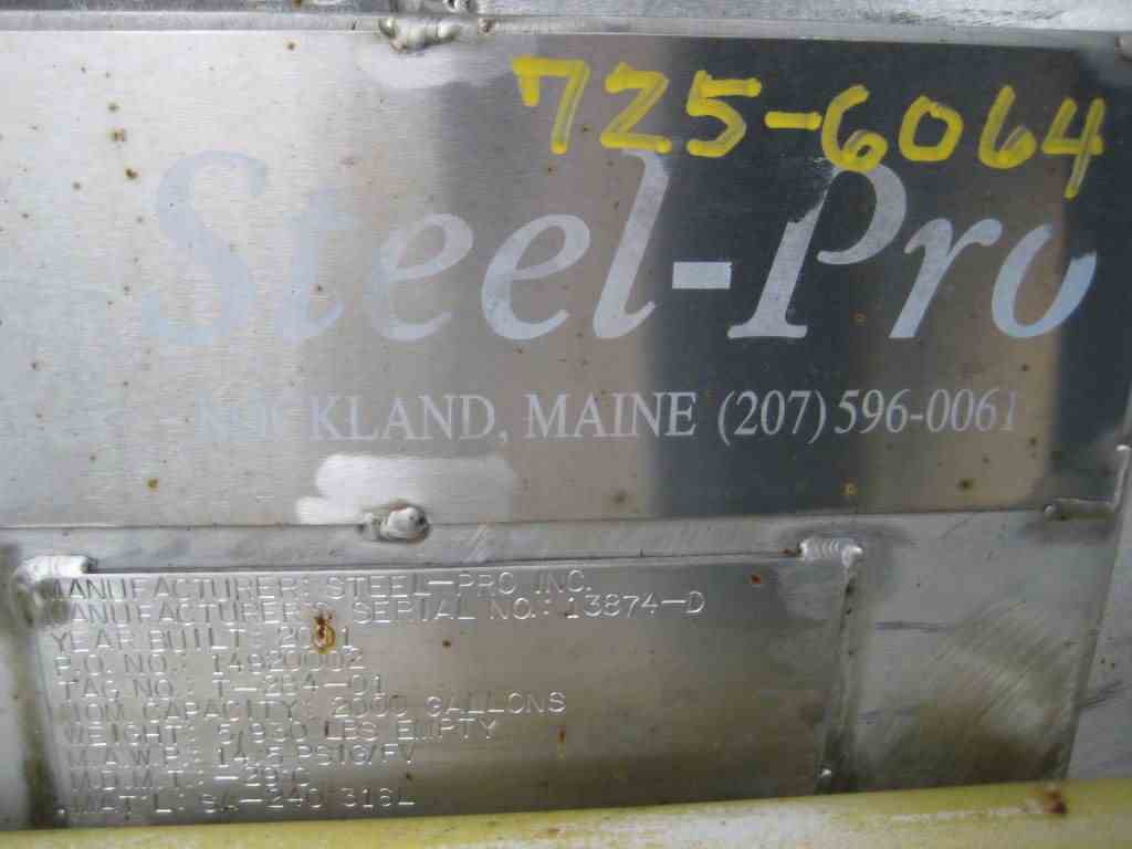 Home » Equipment » Tanks - Stainless Steel » Stainless Steel – 1,000 to 4,999 gal » 2000 Gal Steel Pro Inc. Stainless Steel Tank