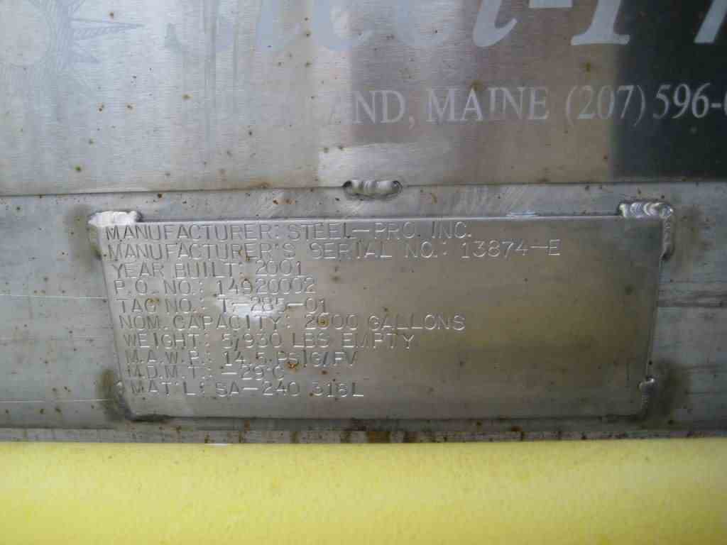 Home » Equipment » Tanks - Stainless Steel » Stainless Steel – 1,000 to 4,999 gal » 2000 Gal Steel Pro Inc. Stainless Steel Tank