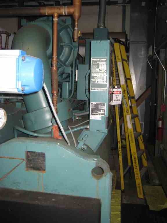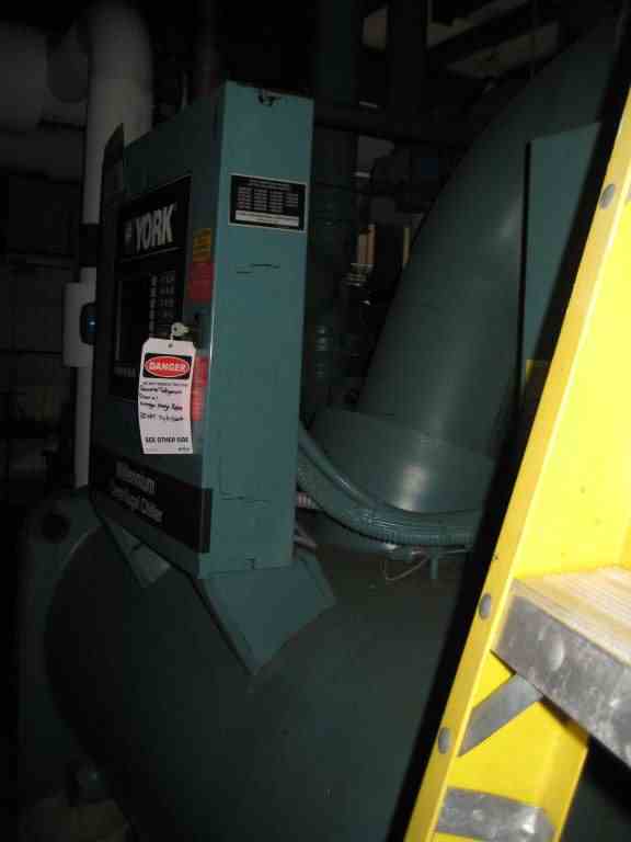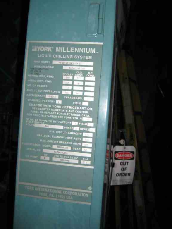 Used York 390 Ton Water cooled Glycol Chiller, Model YKCDDDG4-CME Model YDHA-41-DO Compressor. 255 KW, 3 phase, 60 cycle, 460 volt (373 FLA). 150 PSIG. 1400# charge, 134A refrigerant, 180 PSIG. Built 2001. S/N SEKM-395130. Variable speed drive with Optiview Control Center. Includes O&M Manual.