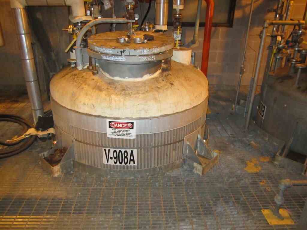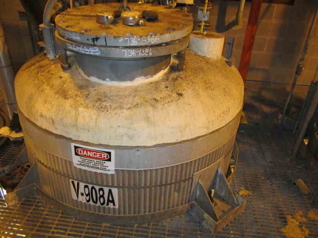 Used 1193 gallon 316L stainless steel vertical pressure vessel, Mfg. by Alabama Heat Exchanger. Rated for 75 psi & FV @ 572 Deg. F. (-58 Deg. F @ 75 psi & FV) internal. Dimensions: 60" O.D. x 84" T/T, lug mounted. Serial # AHE-684, National Board #?, Year Built 2000. Previous Service: Receiver Distillate Grignard, Estimated Weight: 4,625#