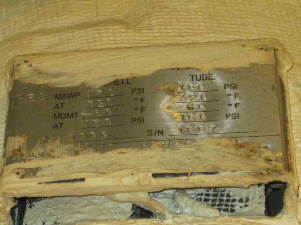 Used approx 18 sq.ft. vertical shell & tube heat exchanger, Mfg. by Allyn America, lug mounted. 316L stainless steel shell rated for 150 PSI @ 320 Deg. F, Approx 6.625" dia x 4' L. (28) .625 dia 316L stainless steel tubes rated for 150 PSI @ -60/320 Deg. F, Nozzles: Shell (2) 2", Tubes (2) 2".Serial # 1557, Year Built: 1999., Previous Service: V-911 Vent Condenser Multi-purpose, Estimated Weight: 500#