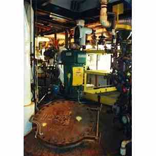 5700 gallon steel agitated jacketed reactor. 9' dia. x 11' straight side. Welded dished heads. MFD by Oehler Industries, Serial # 968492, NB# 148, built 1997. ASME code stamped for 100 psi & FV @ 664 deg. F, half pipe coil jacket rated 180 psi & FV @ 644 deg. F. Equipped with 8" dia. turbine agitator. Mechanical seal on shaft. With Lightnin gear type 72-S-2, Serial# 97E8768102. 21:1 ratio. Output speed 82.5 rpm. With 2.0 hp 3/60/460V, 1730 rpm frame 145T TEFC motor. Openings: Top - 30" manway with cover, 1-6", 6-4", 5-2: 1-4" center bottom outlet. Mounting lugs, lifting eyes.