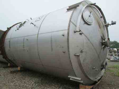 USED CHERRY BURRELL APPROXIMATELY 7,500 GALLON VERTICAL STAINLESS STEEL TANK. 10'8" DIAMETER X 13' STRAIGHT SIDE. WITH DISHED TOP AND BOTTOM HEADS. BOTTOM HEAD JACKETED. 10" TOP CENTER INLET; 8", 4", (3) 2" TOP INLETS; 12" X 18" MANWAY; AND 3" CENTER BOTTOM OUTLET. STAINLESS STEEL SKIRT.