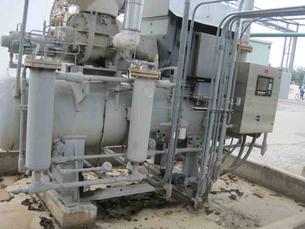 USED TBD TON FRICK/YORK CHILLER PACKAGE MODEL #RWBII 134E, R22 REFRIGERANT, COMPLETE WITH FRICK ROTARY SCREW COMPRESSOR MODEL/SERIAL #TDSH193L3178D2, MAX SPEED @4500 RPM, 350 PSI MAX DESIGN PRESSURE, DRIVEN BY 400 HP MOTOR (MISSING NAME TAG). UNIT IS COMPLETE WITH CONTROL PANEL, CONDENSOR, OIL COOLERS, ETC. UNIT IS SKID MOUNTED - APPROX 6'w x 14'lg x 9' H