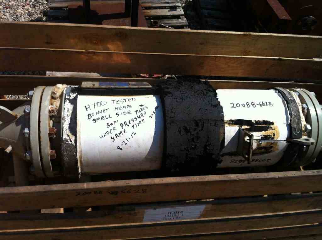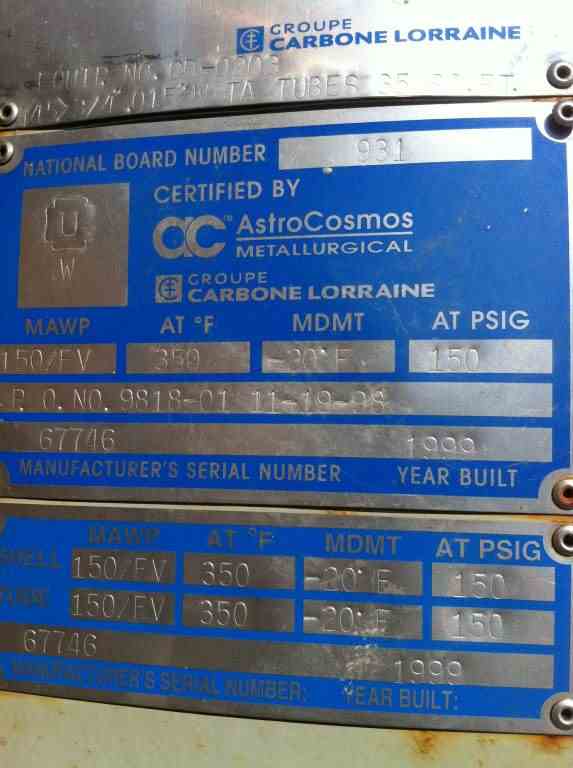 Used 35 Sq. Ft. Tantalum Condenser. Shell rated 150psi and full vacuum, tubes rated 150 psi and full vacuum. Type BEM 10-1-48. 72 1/8" OAL. Expansion joint. (45) 3/4" tubes, 0.015" thick, (tantalum 2.5% w). (1) 3" vapor inlet, (1)2" vapor outlet; (1) 2" x 4" coolant inlet; (1) 2" coolant outlet; (1) 1" liquid drain. Serial #67746, National Board # 931, Built 1999. Previous Use: API Pilot Plant