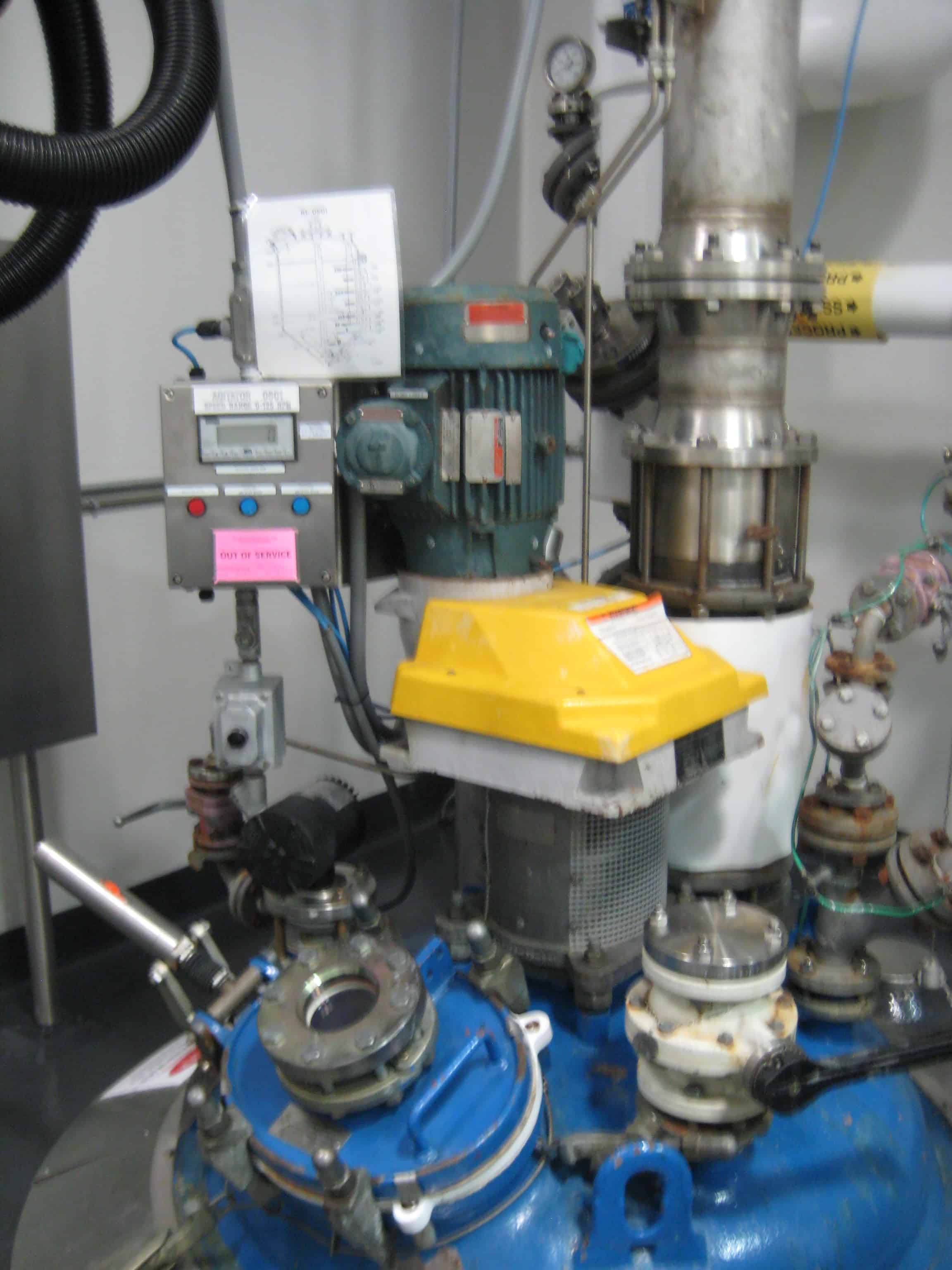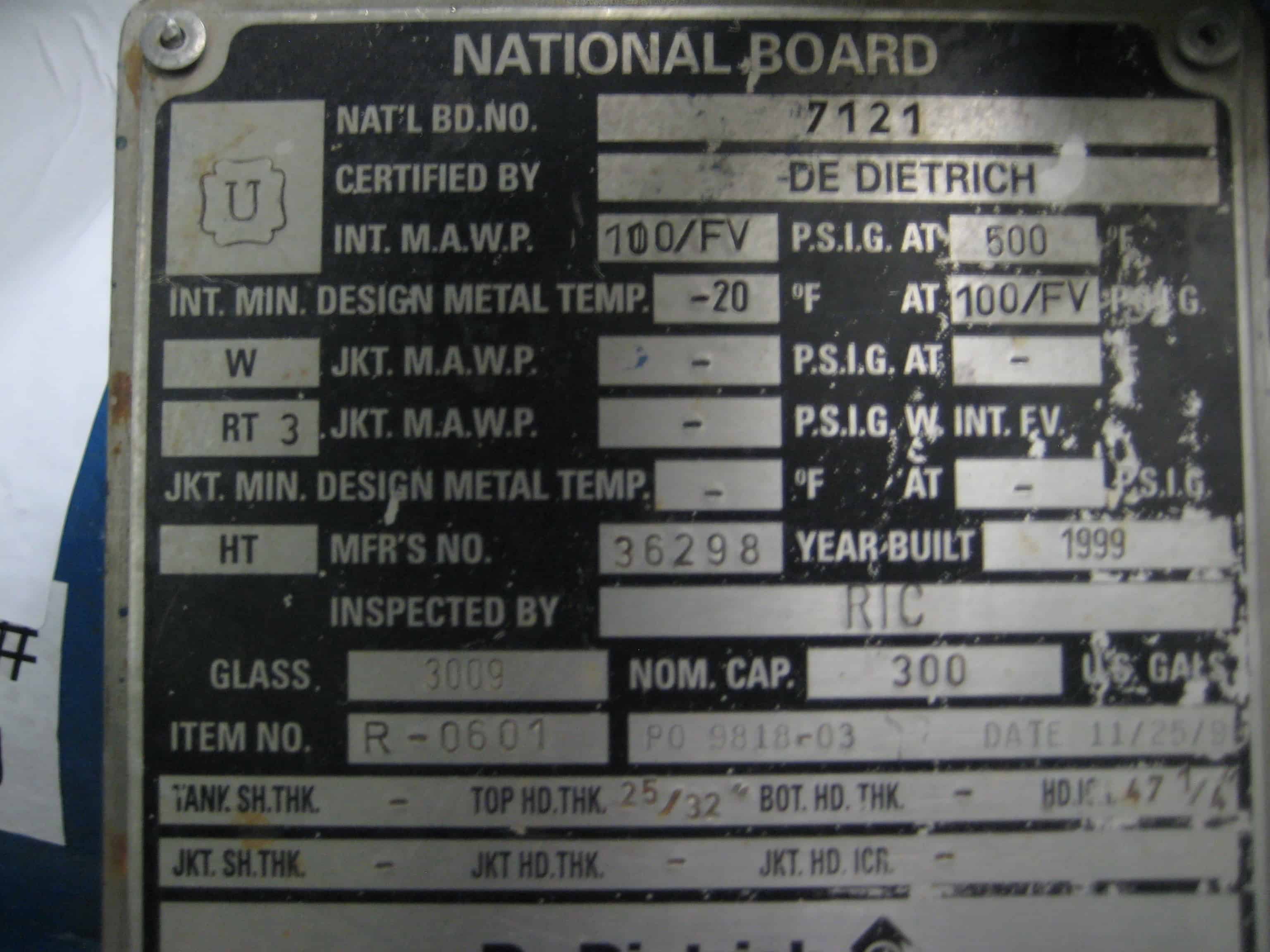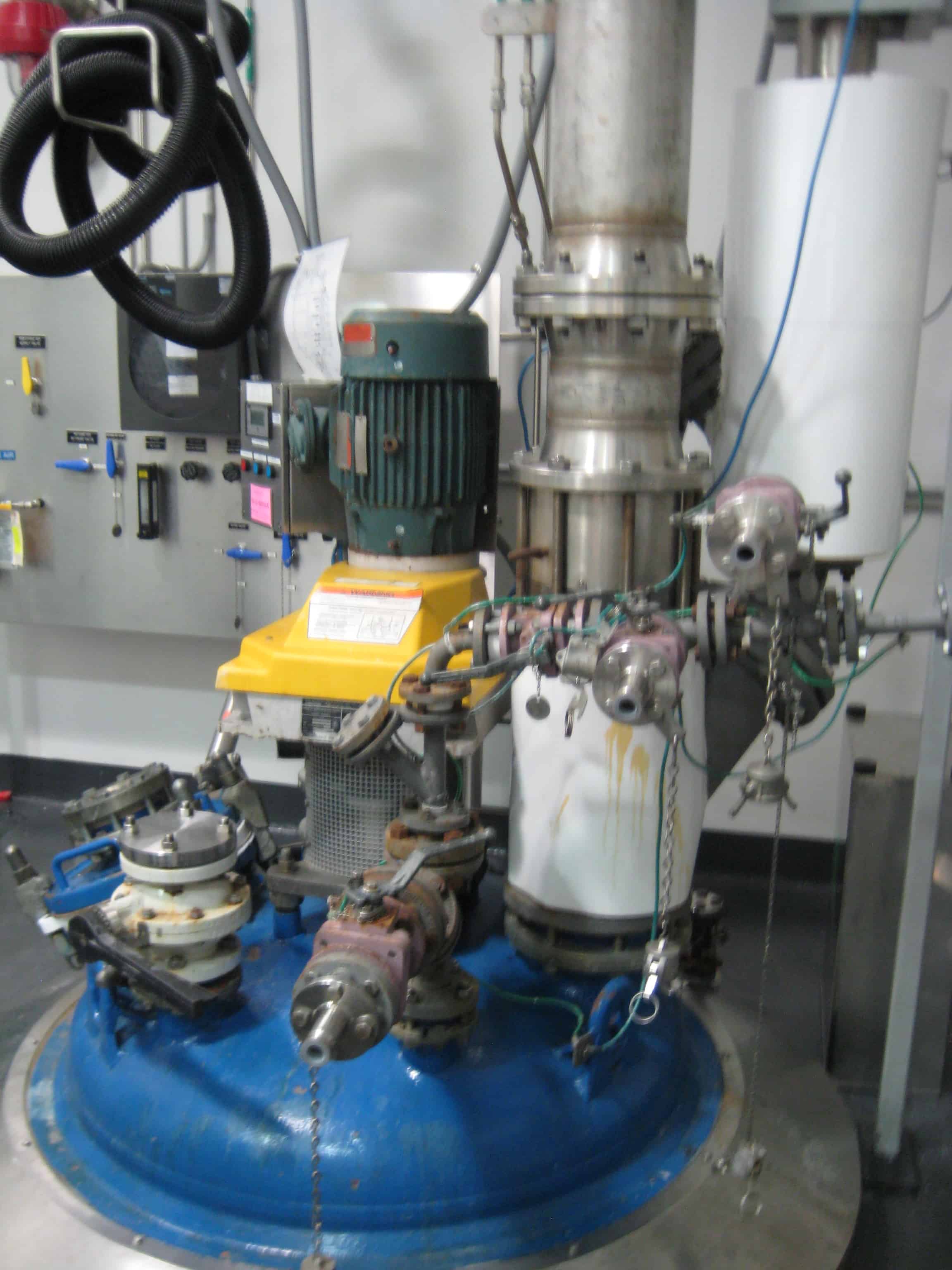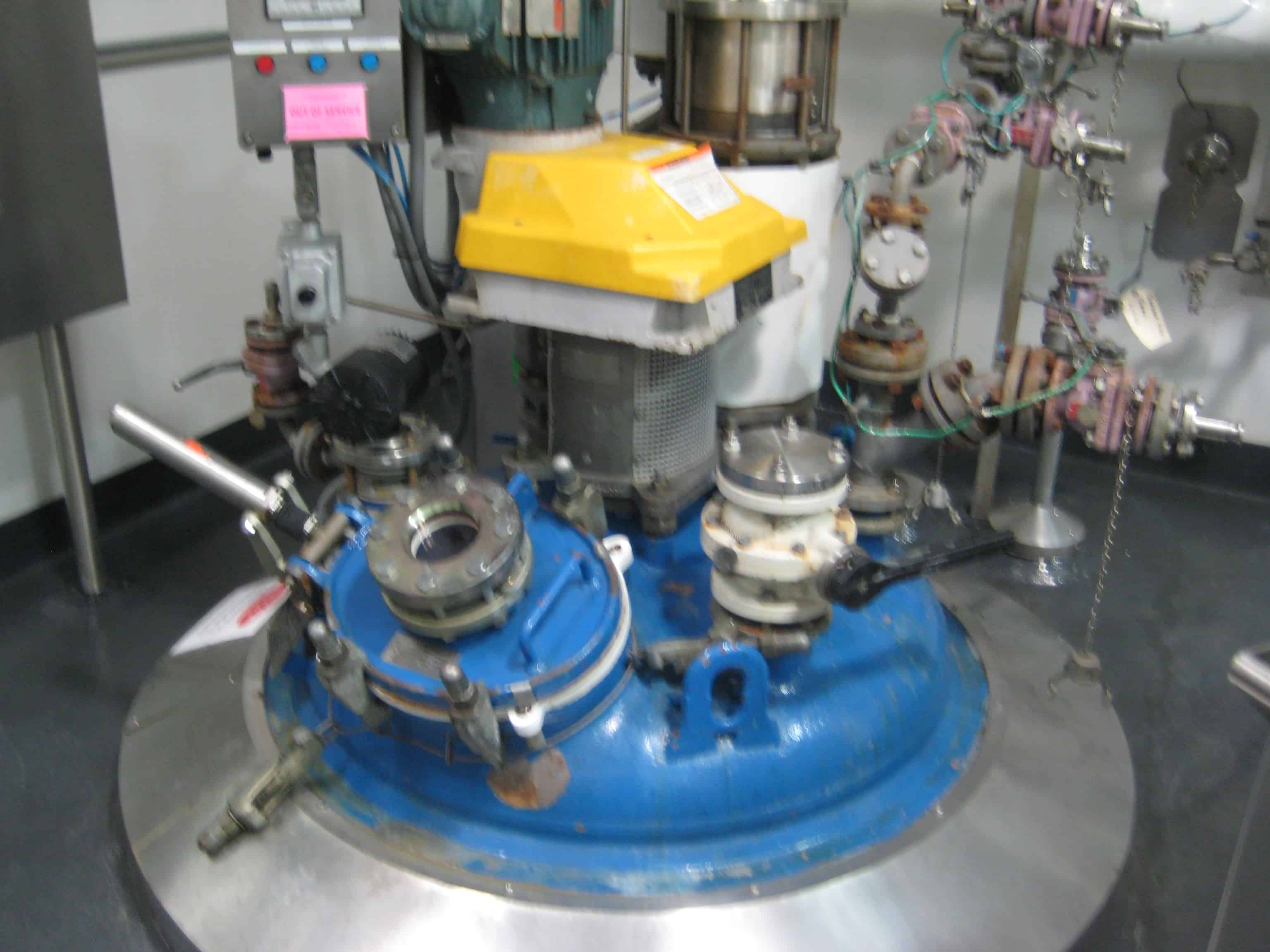 Used 300 gallon DeDietrich Glass Lined Reactor, rated 100 psi and full vacuum at 500 F internal, jacket rated 150 psi and full vacuum at 500 F. Type 3009 Blue Glass. Bolted top, welded cone bottom. 47 ¼” OD x 74 ¾” 304 Stainless Steel sheathing. Lug mounted. 61Q06 DeDietrich Lightnin Series 60 drive assembly. Motor – 7.5 hp, 3 phase, 60 hertz, 460 volt, 1750 RPM. Baffle – Beavertail with DR-Tip. Agitator – (3) blade chevron lower tier, (3) blade turbine upper tier. 12” x 16” manhole; (1) 8” inlet/outlet; (1) 4 3/8” inlet/outlet; (1) 4” inlet/outlet; (2) 3” inlet/outlet; (1) 2” inlet /outlet; (1) 3” center bottom outlet. Serial #36298, National Board # 7121, Built 1999. Weight – 5000 lbs. Previous Use: API Pilot Plant