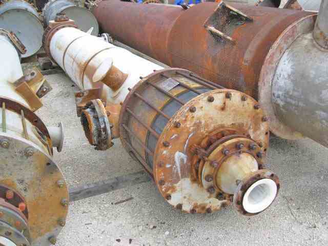 773 Sq Ft Graphite Carbone Vertical Shell & Tube Heat Exchanger. Shell rated 75 psi at 338 F. Tubes rated 25 psi at 338 F. Tube diameter 7/8". Tube length 14'0". Tube holes 241. Tube wall 1.24". Shell diameter 2'4".