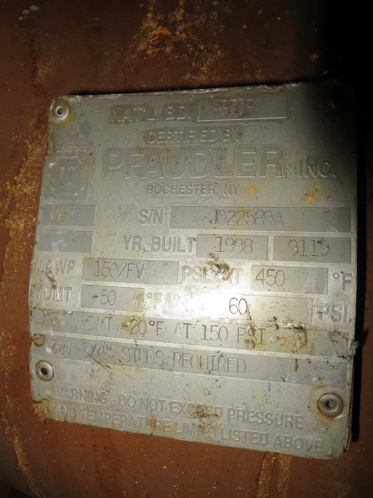 Used 100 gallon Pfaudler glass lined reactor, rated 150 psi / FV@ 450 F internal and 125 psi / FV @ 450 F on the jacket. 9119 Glass. TW drive, 3 blade reverse curve impeller agitator. 32” ID x 36 1/4” Deep. Serial # J022589, National Board #49510, Built 1998.