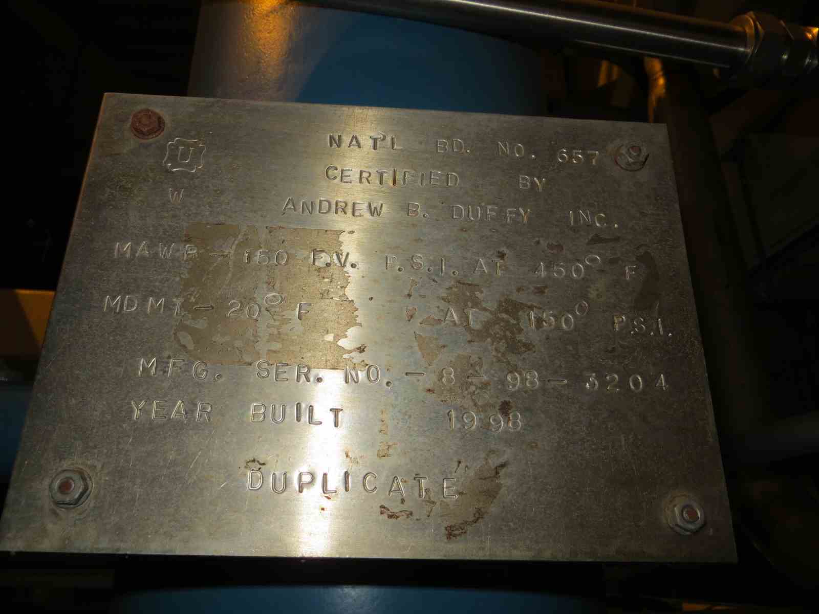 ANDREW B. DUFFY Vertical packed column, 10" dia x 75" F.OF. (111" overall length). Carbon steel w/internal coating of nom. 40 mil. Fluoroshield and packed with (12) 10" d x 6" thick Koch Flexeramic 28P elements. Design info: 150 psig/FV@ 450 degF (Max) & -20 F min. National Board # 657 and s/n 8-98-3204, unit is lug mounted. With U-1 data report, drawings and photos. 650# empty.