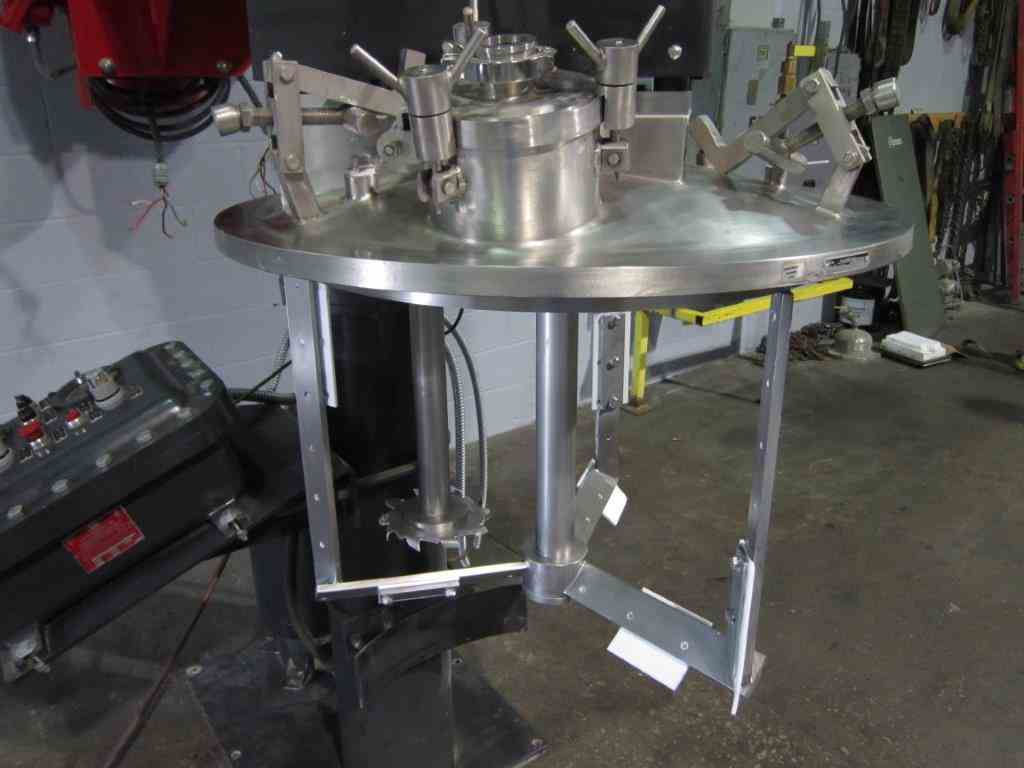 Floor mount, with air over oil lift. Equipped with a high speed blade and a slow speed sweep and scraper. 10 HP High Speed Blade, 5 HP sweep and scraper blade. 230/460 V Ex-Proof Motors, rated for variable speed, via VFD. XP control panel. Control panel has push buttons and VFD readout, no motor starters. Stainless Jacketed can w/polyurethane casters - 29.5" dia. x 22" deep. Mix tank has bottom side discharge out the front with valve. Sweep is on bottom and sides.