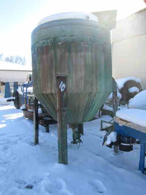 Used 1,100 Gal Stainless Steel Tanks, 6' dia x 4' straight side. Dished top, 30” cone to a 36” diameter dish bottom. Legs have been cut down 21" and saved, currently to 117" overall height. (This height allows the tanks to ship on a single drop standing up) Top inlets: 12" x 28" bag dump opening with cover. 30" center inlet, (2) 2" threaded inlets, (1) 4" flanged inlet. Center bottom outlet. 2" Flush mount discharge valve.