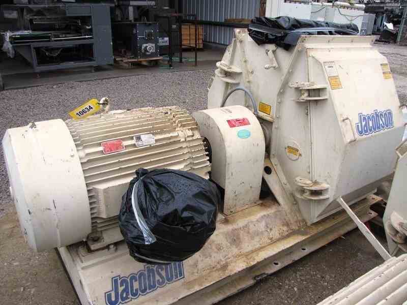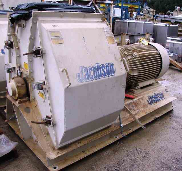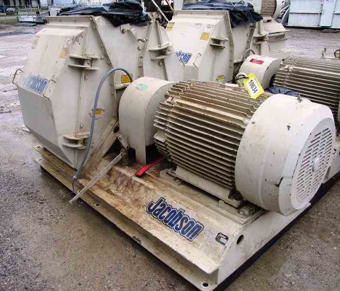 USED 200 HP USED CARTER DAY JACOBSON XLT-42326 FULL CIRCLE HAMMERMILL, S/N: 37384. TOP GRAVITY FED FLANGED INLET 10"W. X 20 1/2"L. HIGH CAPACITY FOR MEDIUM TO FINE GRINDING, BOTTOM DISCHARGE. LARGE SIDE-ACCESS ROTOR PANELS, CARBON STEEL CONSTRUCTION WITH HEAVY-DUTY BASE. POWERED BY 200 HP RELIANCE DUTY MASTER AC MOTOR, 1785RPM, 460V, 218 AMPS, 3PH, 60HZ. BASE MEASURES 48"W. X 88"L. X 4'-7 1/2"H. TO INLET. (NOTE: COMPLETE SYSTEM IS AVAILABLE AT ADDITIONAL COST. SYSTEM INCLUDES: FEEDER, MAGNETS, HAMMERMILL, DUCT WORK & TRANSITIONS, FILTER RECEIVER DUST COLLECT, PNEUMATIC CONVEYING BLOWER. PLEASE CALL IF INTERESTED)