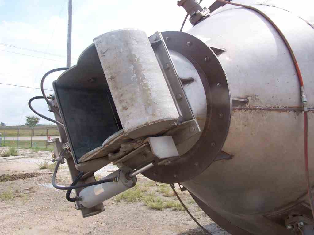 Used 11,200 Gallon (1,500 Cubic feet) Vertical 304 Stainless Steel Silo. 135" diameter x 180" straight side and 108" coned bottom. Top opening 16" x 16" no cover and a 6" diameter. Side opening 21" x 37" bolted on cover. 17" x 17" bottom outlet with air operated doors. Comes with a carbon steel stand.