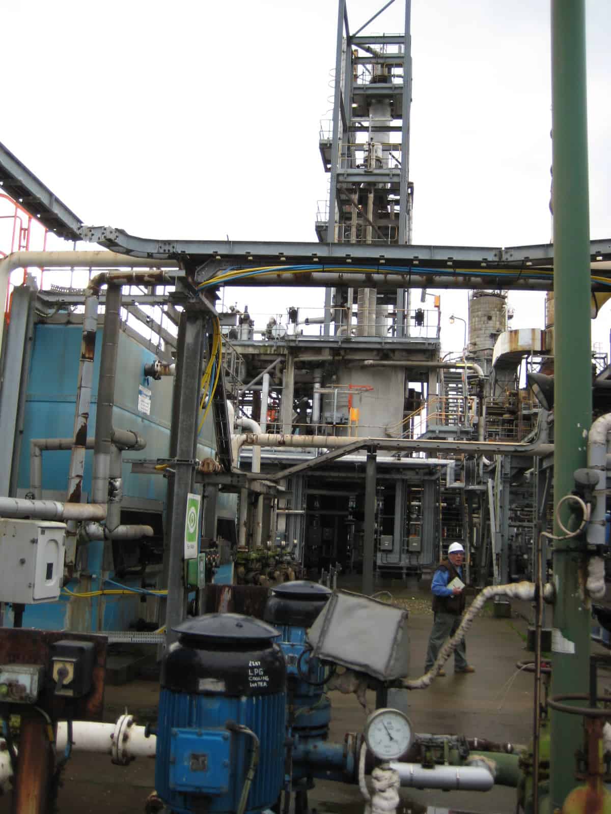 Crude Oil off gas leaves the refinery's crude distillation unit and enters the LPG recovery unit. Feed gas is compressed and any liquid is suctioned out into the Reflux Accumulator. Condensed gas gets pumped from the LPG column feed drum into the distillation column. The objective of the distillation section is to separate C2's as a gaseous product to fuel, C3+C4's as LPG to be exported elsewhere, and C5+'s as Naphtha recycled to the reflux accumulator in the refinery's crude unit. Overhead vapor from the distillation column is condensed against cooling water. LPG Product is pumped from the Reflux Drum and a portioned is returned to the distillation tower as reflux. Off-gas from the Column Feed Drum is collected and burned in the furnace of the refinery's crude oil unit.