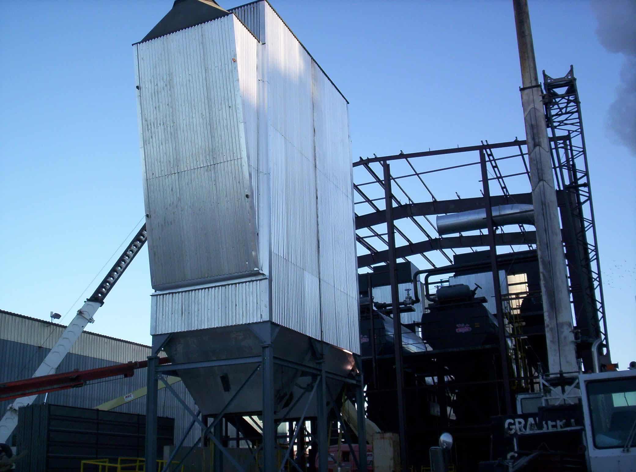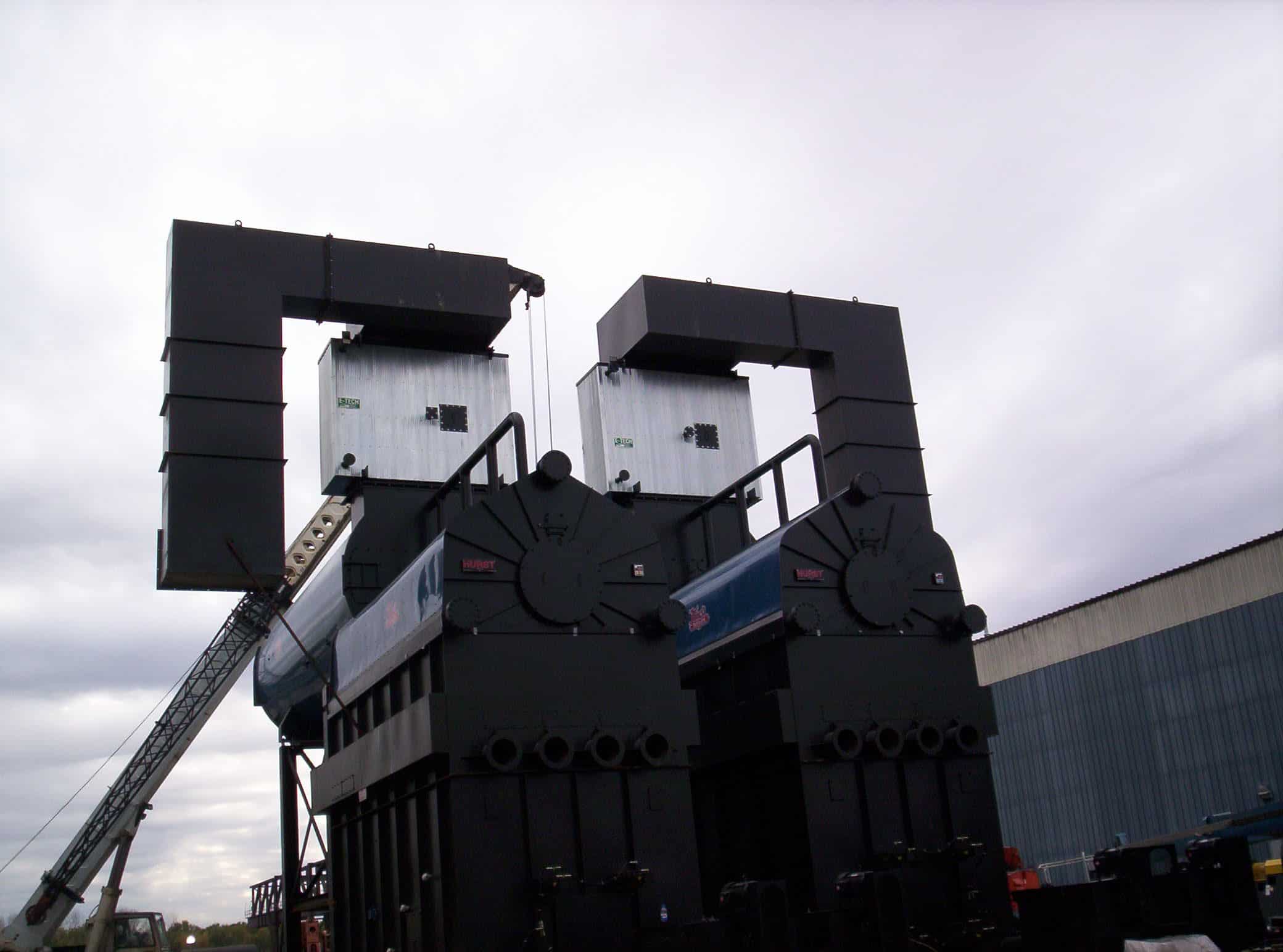 Used dry wood waste-fired STEAM plant. 2600HP/ 89700 PPH/ 200 PSIG. Composed of the following: (2) substoichiometric wet wood waste/biomass fuel gasifiers, combustors and heat recovery systems fed from metering bins. Each unit capable of 8232 lb/hr @20% moisture content. (2) High Pressure Hybrid boilers manufactured by Hurst Boiler and Welding Co.(Fire tube/water tube design) - 1300HP/ 44850PPH Steam output from and @212F, 200PSI. Recommended Operating pressure. (2) Box-type Economizers design rated 300PSI@700F with inlet and outlets. 55 Kv/300ma Precipitator with collecting plates and rigid discharge electrodes.