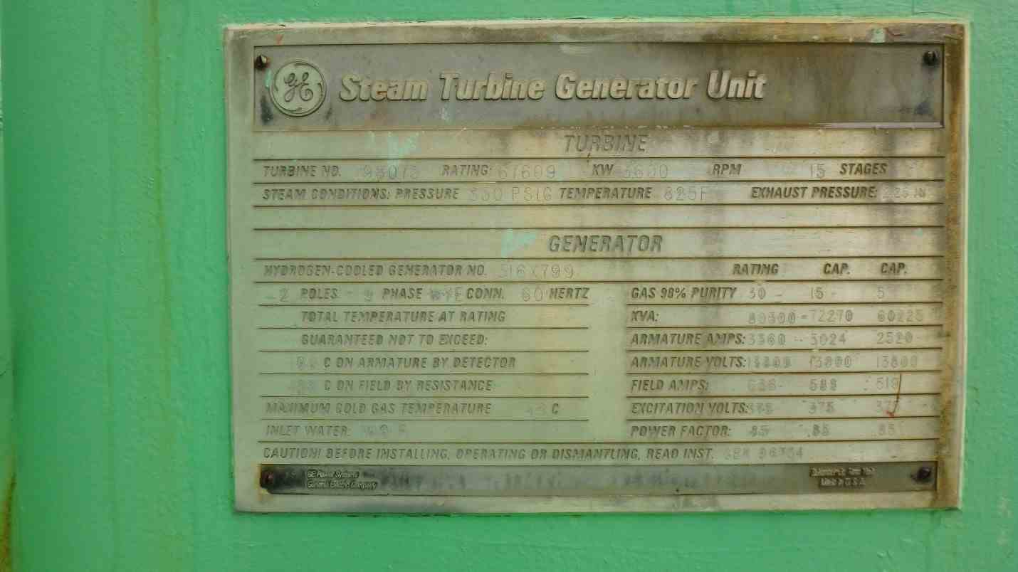 Used 66MW (66086 KW) GE steam turbine generator. Single automatic condensing. 3600RPM. (3) uncontrolled extractions. Steam conditions: 850 psig at 825 F, backpressure 4” Hg. Abs. Mark 6E Turbine Govern Controls rebuilt in 2013. Turbine No. 198075. Built 1990. Generator: Hydrogen cooled - 98% at 30 psig. 80300KVA. Armature Amps 3360, Armature volts 13800. Field Amps 667. Exciter volts 375. Power Factor 0.85. Generator No. 316X799. Built 1990. Also avilable : Graham Manufacturing Co., Inc. surface condenser, Cooper main step-up transformer and Bos Haten feedwater heater.